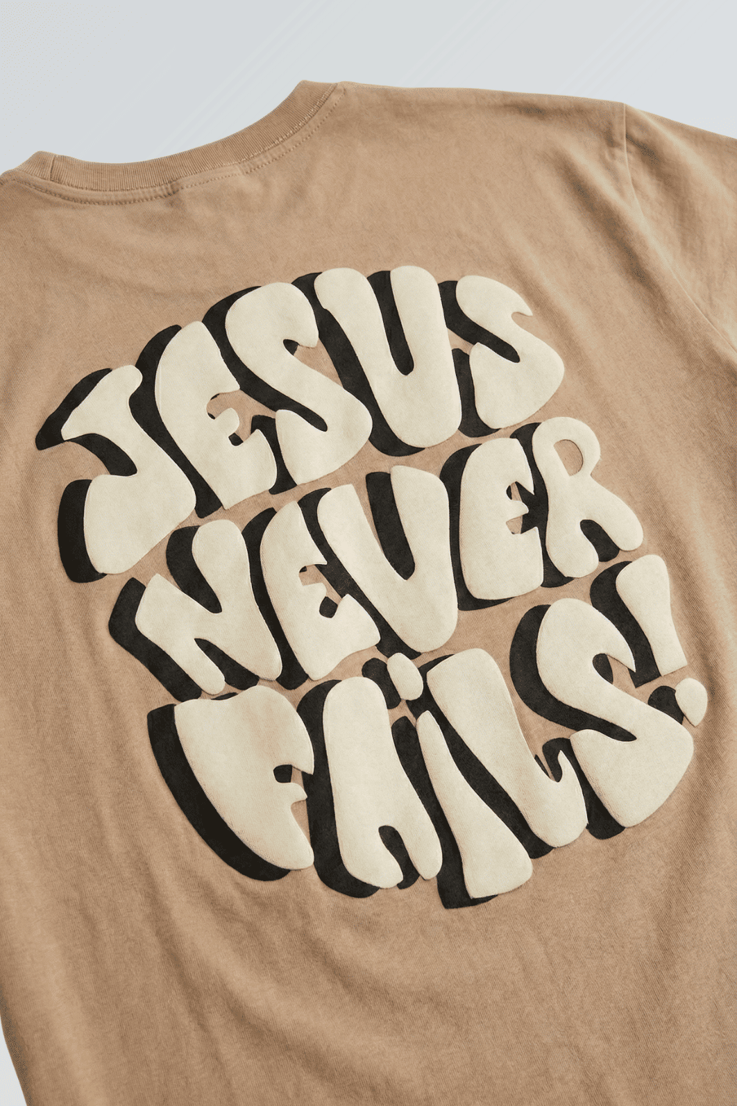 Confeccionada em malha 100% algodão de toque superior, ela proporciona uma sensação de frescor e liberdade de movimentos durante todo o dia. O visual é marcado pelo minimalismo na frente e ganha força nas costas com a estampa exclusiva "Jesus Never Fails". A combinação das cores Preto e Bege sobre o tom Capuccino cria um contraste moderno e cheio de personalidade.